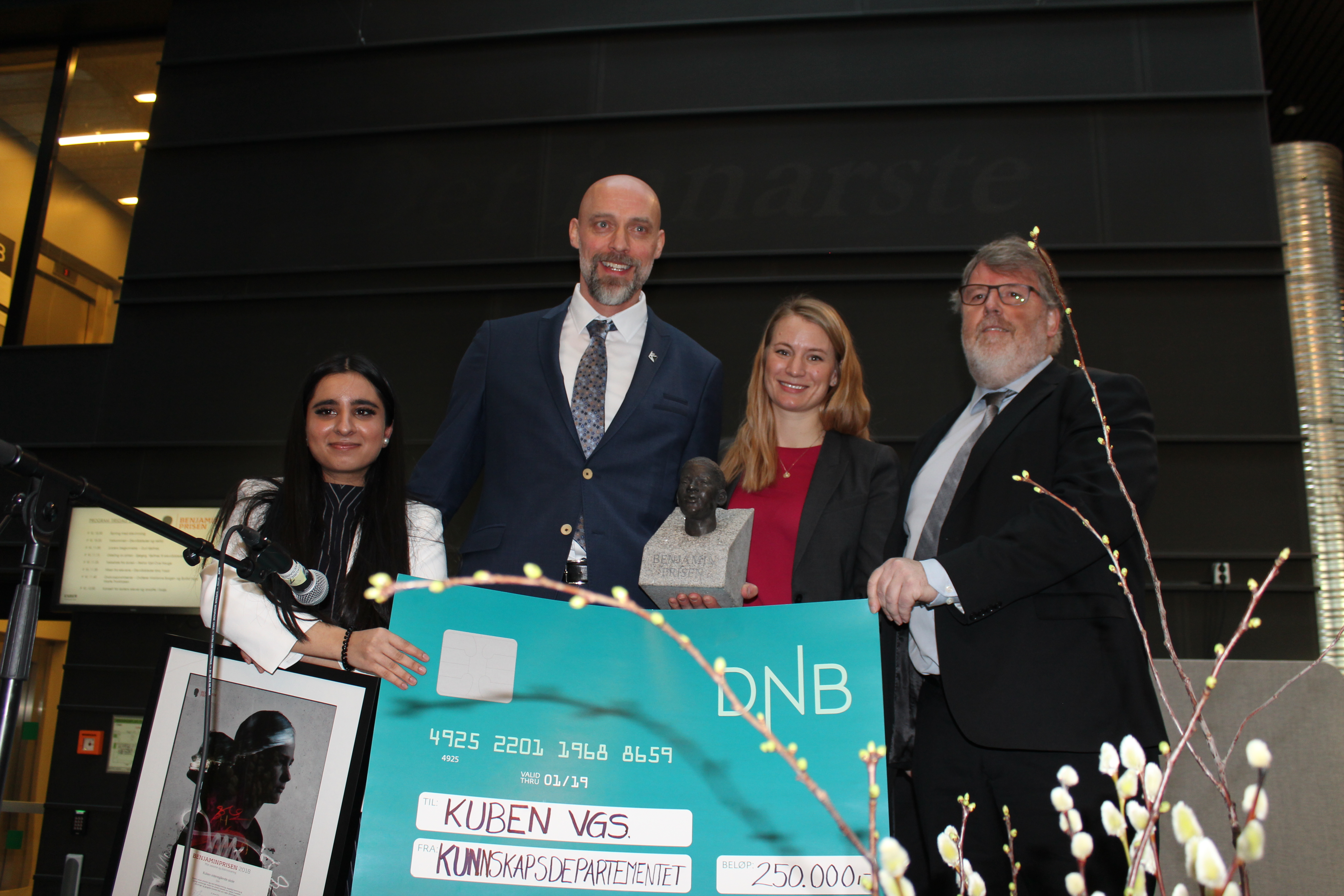 En politikertung forsamling, med statssekretær, skolebyråd, ordfører og bydelsleder, sammen med en stor andel av skolens 1400 elever, samt lærere og en fornøyd jury fikk overvære prisoverrekkelsen i Kubens luftige og romslige foaje.