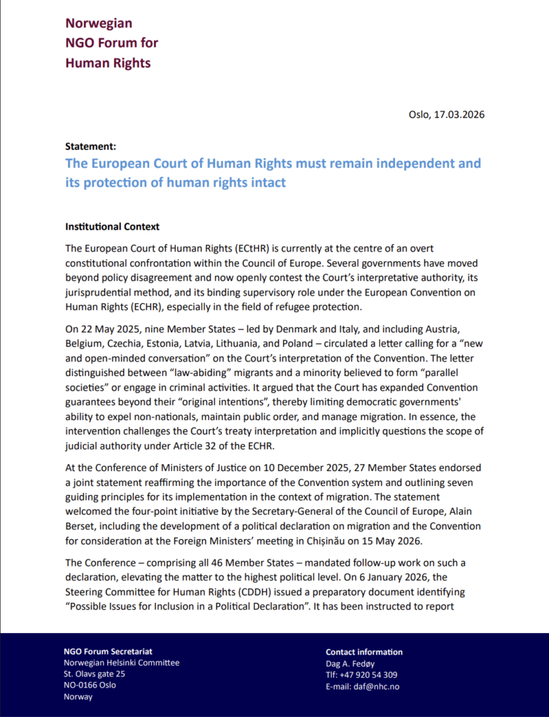 I uttalelsen nedenfor uttrykker vi, sammen med øvrige medlemmer av NGO-forum for menneskerettigheter, bekymring for en utvikling der statlige aktører utfordrer domstolens uavhengighet, dens rettslige fortolkning og den bindende karakteren av dens avgjørelser.